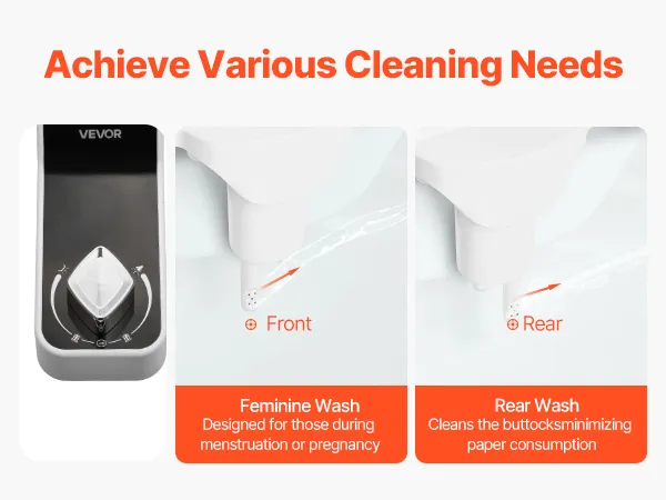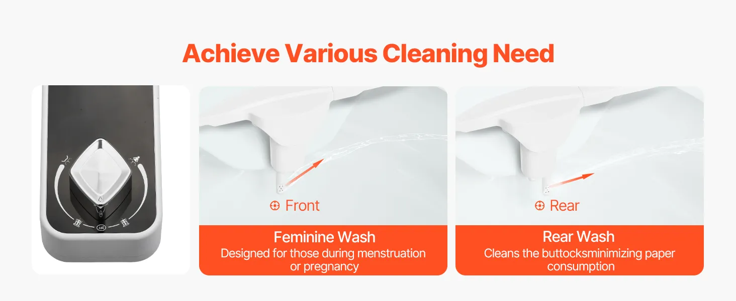 Zwei Reinigungsmodi: Dieser Bidetaufsatz mit zwei Düsen bietet separate Funktionen für die Intim- und Gesäßdusche und ist auf unterschiedliche Reinigungsbedürfnisse zugeschnitten, insbesondere für die sanfte Pflege von Schwangeren und Frauen während ihrer Periode