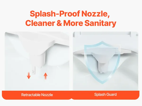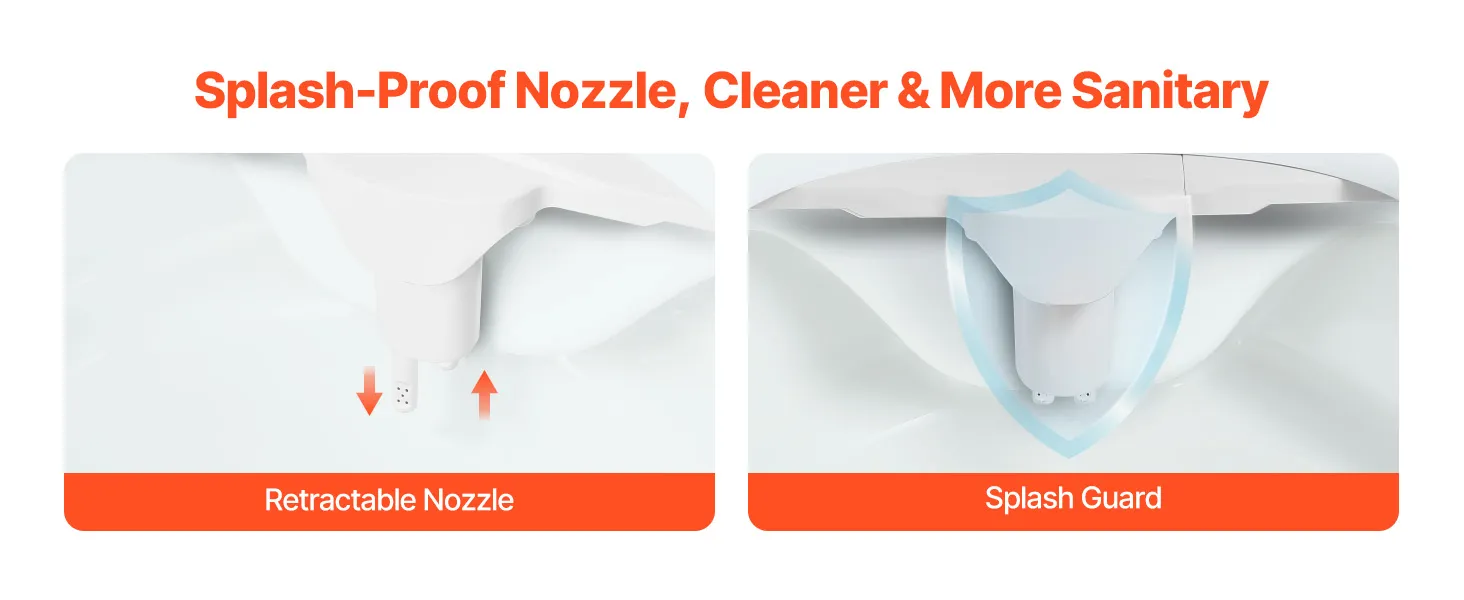 Einziehbare Düse: Der Bidetaufsatz verfügt über eine einziehbare Düse und einen Spritzschutz. Die Düse kehrt bei Nichtgebrauch automatisch hinter den Spritzschutz zurück, um ihn sauber zu halten und Spritzer oder Schmutz zu vermeiden