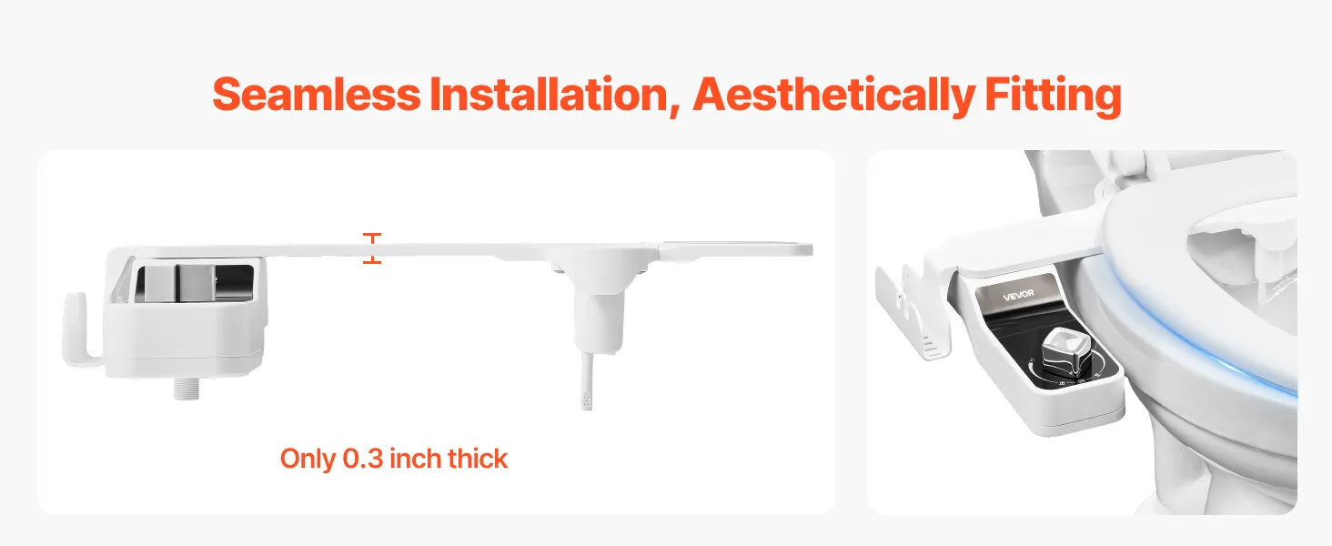 Nahtlose Installation: Mit einer schlanken Dicke von 0,3 Zoll (7 mm) lässt sich dieser Bidetaufsatz für die Toilette bündig und ohne Lücken installieren, fügt sich problemlos in die meisten Toiletten ein und ergänzt moderne Badezimmerstile