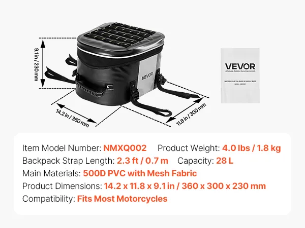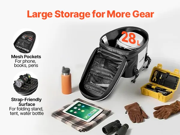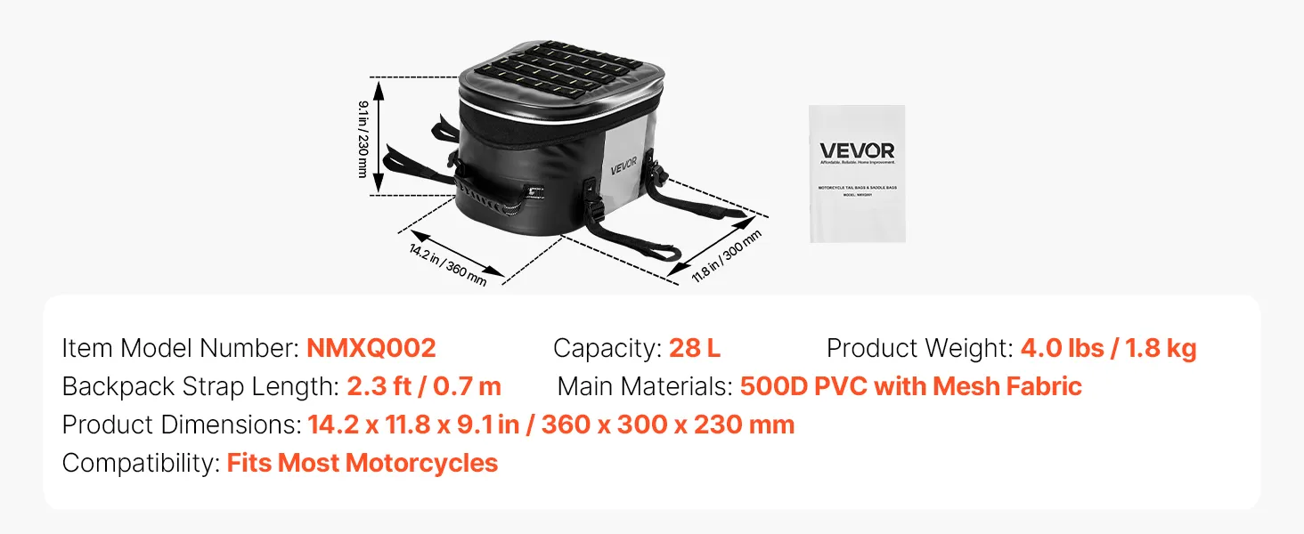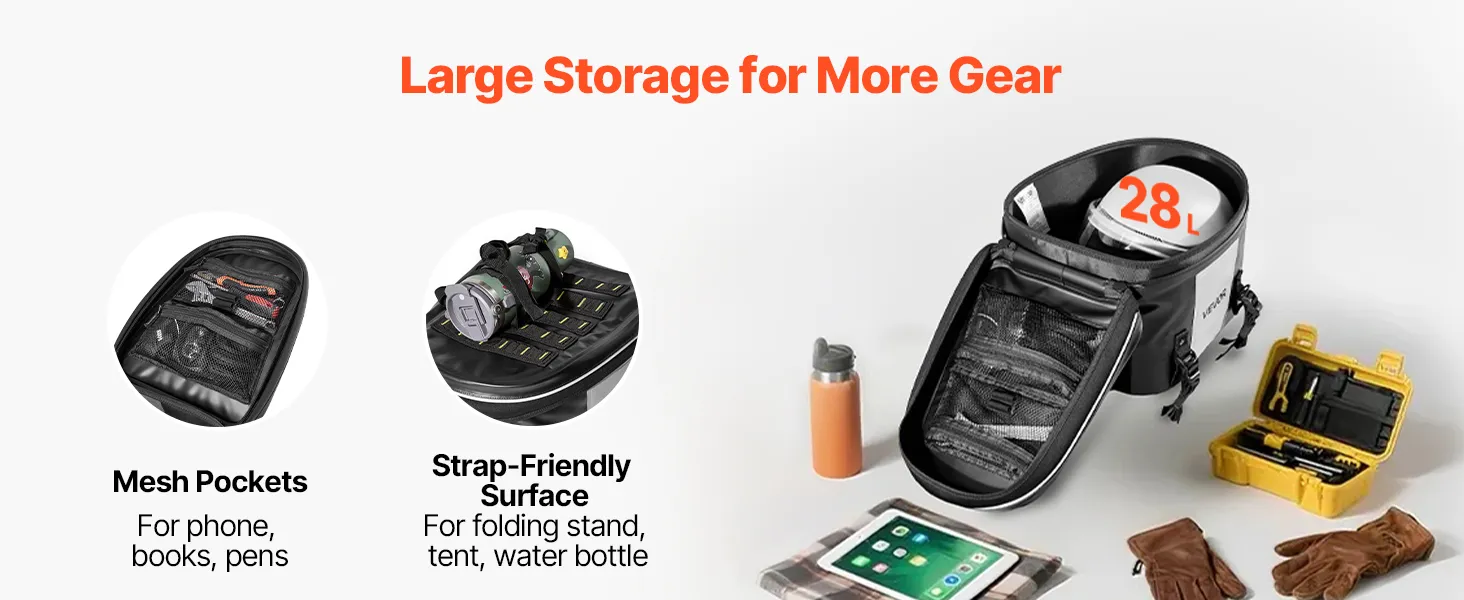 28 L großes Fassungsvermögen: Mit den Maßen 14,2 x 11,8 x 9,1 Zoll (36 x 30 x 23 cm) bietet diese Gepäcktasche problemlos Platz für Helm, Motorradjacke, Regenbekleidung, Verpflegung und Reparaturwerkzeuge. Die Netz-Innentasche bietet Platz für Elektronik, Dokumente und andere kleine Utensilien