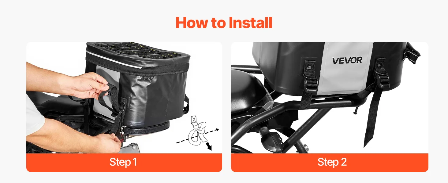 Passend für die meisten Motorräder: Diese Motorradhecktasche passt für die meisten Motorräder, einschließlich Touren-, Standard-, Cruiser- und Dirtbikes. Die seitlichen Gurte lassen sich durch die Rahmenlöcher oder den hinteren Handlauf führen und ermöglichen so eine schnelle Montage. Durch Festziehen der Schnallen bleibt die Tasche stabil
