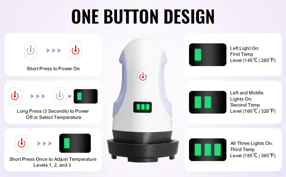 Einknopfbedienung: Zum Einschalten kurz drücken. Nach dem Einschalten erneut kurz drücken, um die Temperatureinstellung zu wählen. Drei Einstellungen stehen zur Auswahl. Mit nur einer Taste können Sie die Temperatur einstellen, die Maßeinheit ändern und das Gerät einfach ein- und ausschalten.