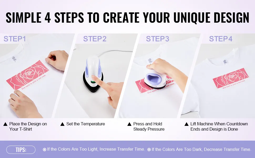 Sie können verschiedene Zeiten und Temperaturen wählen, je nach Ihren kreativen Bedürfnissen. Diese Shirtpresse ist für verschiedene Heißpressmaterialien geeignet. Die einfache Bedienung ermöglicht auch Anfängern eine schnelle Einarbeitung.