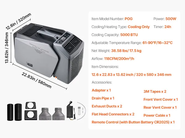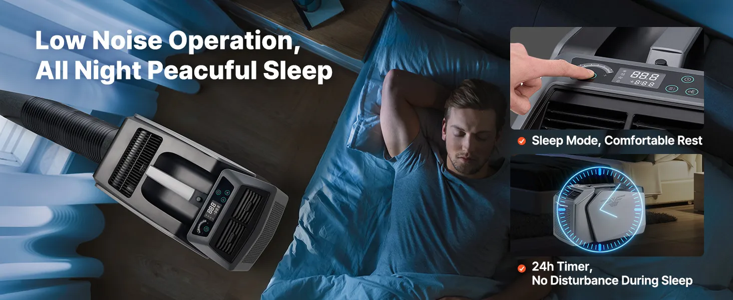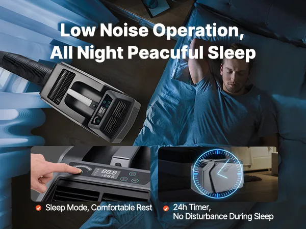 Multiple modes and settings: This camping air conditioner offers cooling, sleep, dehumidifying, and fan functions, as well as adjustable fan speeds and a 24-hour timer. Save energy while meeting various needs.