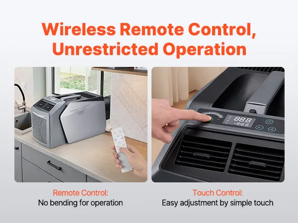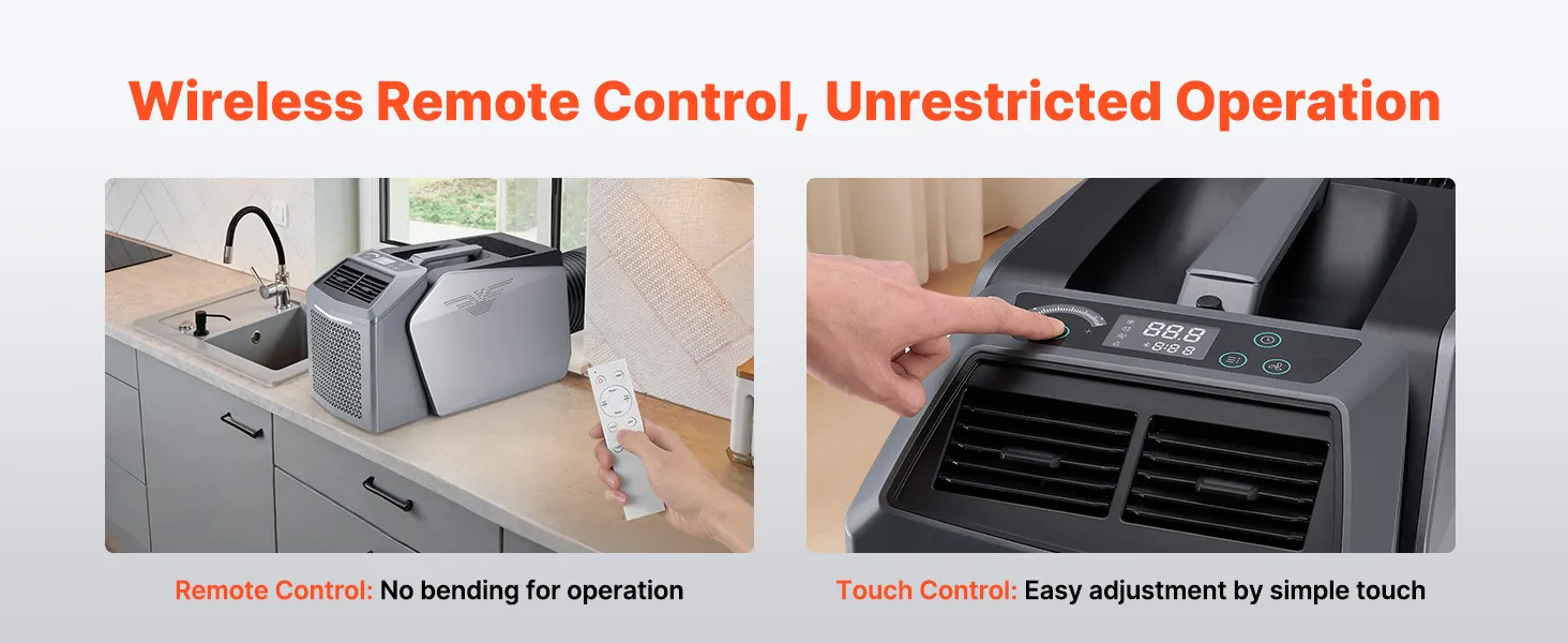 This portable air conditioner supports both remote control and touch controls. The remote control allows for operation from a great distance without having to bend down. The touchscreen is easy to use and allows for convenient and quick adjustment of temperature and modes!