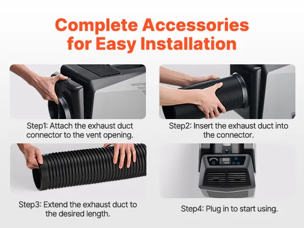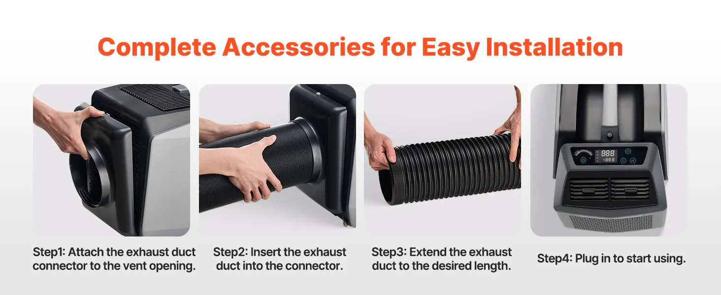 Our camping air conditioner comes complete with exhaust hoses, vents, and comprehensive installation accessories. Thanks to the easy-to-understand installation steps, you can set it up quickly and effortlessly.