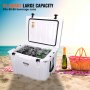 weißer tragbarer VEVOR-Kühler mit 65 qt Fassungsvermögen, schwarzen Verschlüssen und den Maßen 25,2" x 18,3" x 18,7".