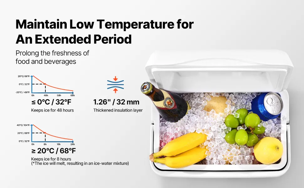 Langanhaltende Kühlung: Mit einer 1,26 Zoll (32 mm) dicken Isolierschicht hält es Eis bis zu 48 Stunden bei Temperaturen unter oder gleich 32 °F (0 °C) und bis zu 8 Stunden bei Temperaturen über oder gleich 68 °F (20 °C) (Eis schmilzt zu Eiswasser). Tipp: Um optimale Ergebnisse zu erzielen, sollten Sie direkte Sonneneinstrahlung vermeiden und mindestens 40 % Eis im Verhältnis zum Gesamtvolumen verwenden
