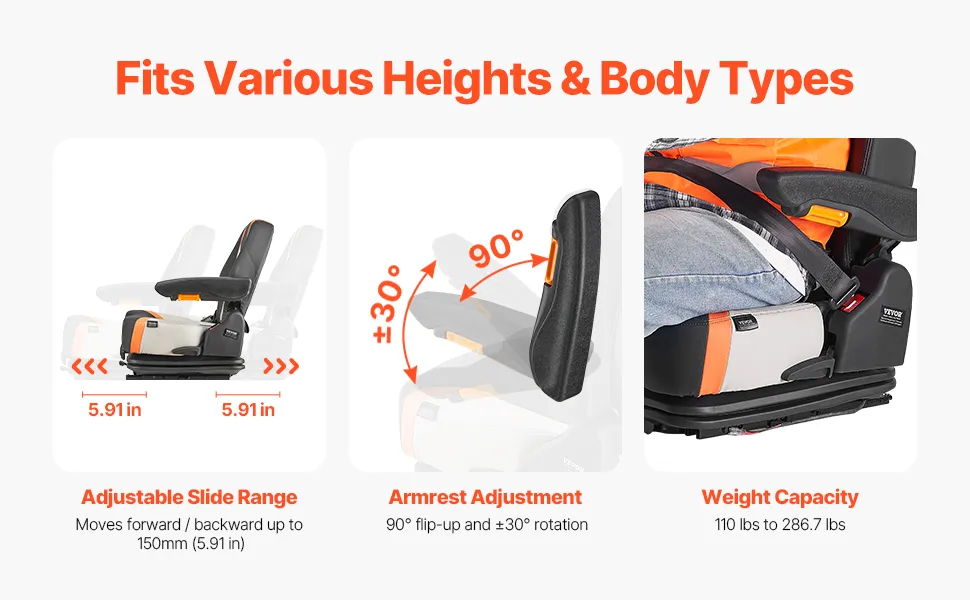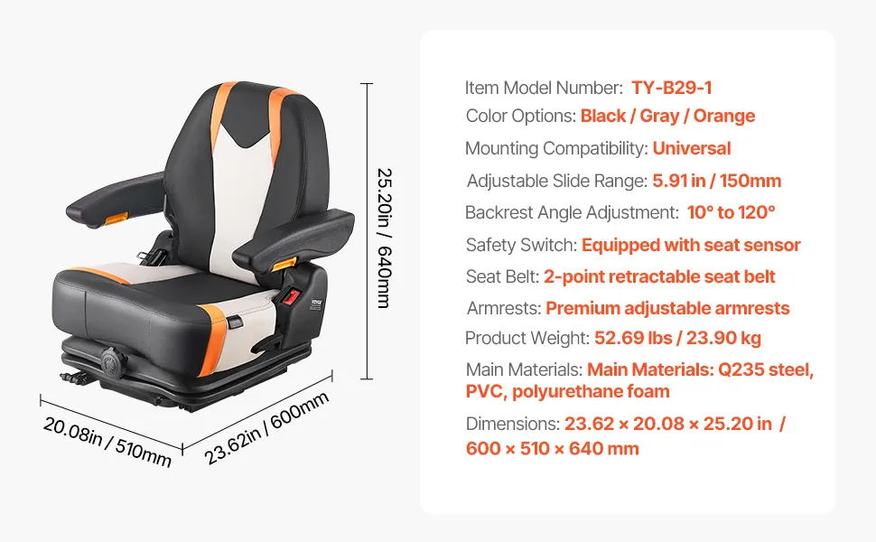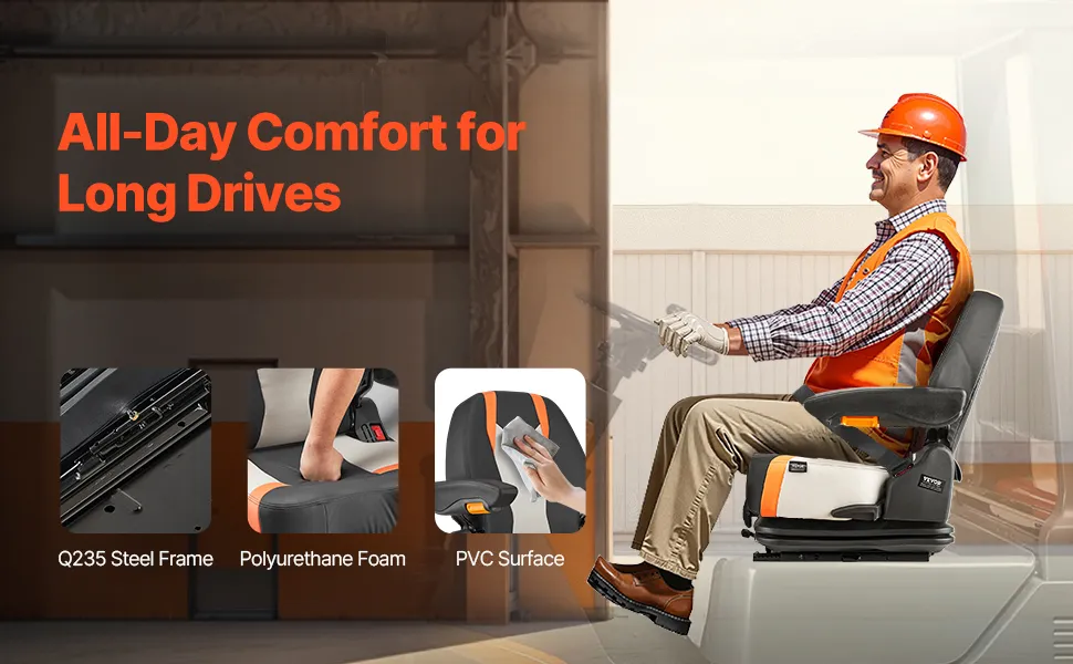 Dieser Sitz ist ideal für Gabelstapler, Mäher, Traktoren und Bagger und gewährleistet Komfort und Sicherheit in verschiedenen Arbeitsumgebungen.