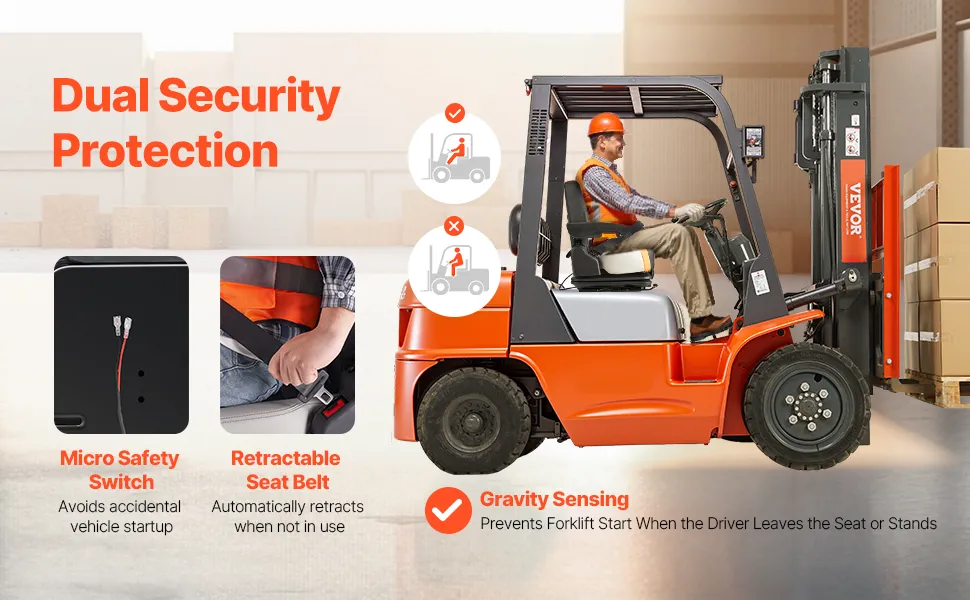 Der Sitz verfügt über einen Mikroschalter, der verhindert, dass der Gabelstapler startet, wenn der Fahrer nicht sitzt, und so für Sicherheit sorgt. Der einziehbare Sicherheitsgurt bietet Schutz während des Betriebs und wird bei Nichtgebrauch automatisch eingefahren.