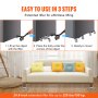 Installationsanleitung für den VEVOR-Möbelwagen: Heber einsetzen, Wagen platzieren, für alle Ecken wiederholen und langsam bewegen.