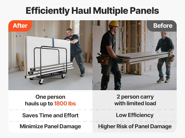 Hohe Tragfähigkeit: Dieser Transportwagen trägt bis zu 816 kg. Die breite Basis trägt mühelos Trockenbauwände, Sperrholz, Stein oder Glas, was die Effizienz steigert und Energie spart. Zwei Fächer sorgen für Ordnung und einfachen Zugriff.