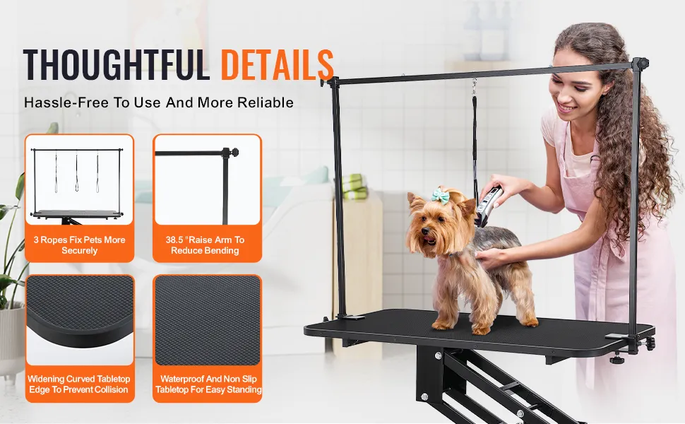 Es ist auch wichtig zu beachten, dass die VEVOR-Tischplatte rutschfest ist. Dieser rutschfeste Hundepflegetisch sorgt für die Sicherheit der Haustiere während der Pflege. Die rutschfeste Materialbeschichtung dieser Tischplatte sorgt dafür, dass die Haustiere stabil und sicher stehen. Außerdem verhindert die rutschfeste Oberfläche, dass die Haustiere ausrutschen oder fallen. Dies ist besonders wichtig während der Pflegesitzungen. Das Design des Tisches eliminiert jegliches Unfallrisiko. Darüber hinaus ist dieser Aspekt während der Pflege wichtig. Obwohl wir nicht alle Unfälle verhindern können, verringert eine rutschfeste Oberfläche das Risiko erheblich. Das Ziel ist eine effizientere Pflege, ohne das Risiko zu eliminieren. Was an der wasserdichten Beschichtung wirklich auffällt, ist, dass sie das Aufräumen nach einer Pflegesitzung erleichtert. Ein wichtiges Sicherheitsmerkmal unserer VEVOR-Tischplatte ist das rutschfeste Modell. Es trägt dazu bei, sicherzustellen, dass die Haustiere während des gesamten Pflegevorgangs sicher und geschützt bleiben.