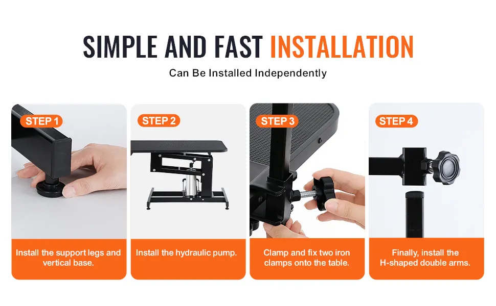 Der Aufbau des VEVOR-Pflegetisches ist einfach. Es sind nur vier Schritte erforderlich. 1. Installieren Sie die Stützbeine und die vertikale Basis. 2. Installieren Sie die Hydraulikpumpe. 3. Klemmen Sie die beiden Eisenhalterungen fest auf den Tisch. 4. Installieren Sie H-förmige Doppelarme. Dies macht es für neue Benutzer bequem. Das Design des Tisches vereinfacht den Installationsprozess und spart Zeit und Mühe. Sie können sofort mit der Pflege Ihrer Haustiere beginnen.