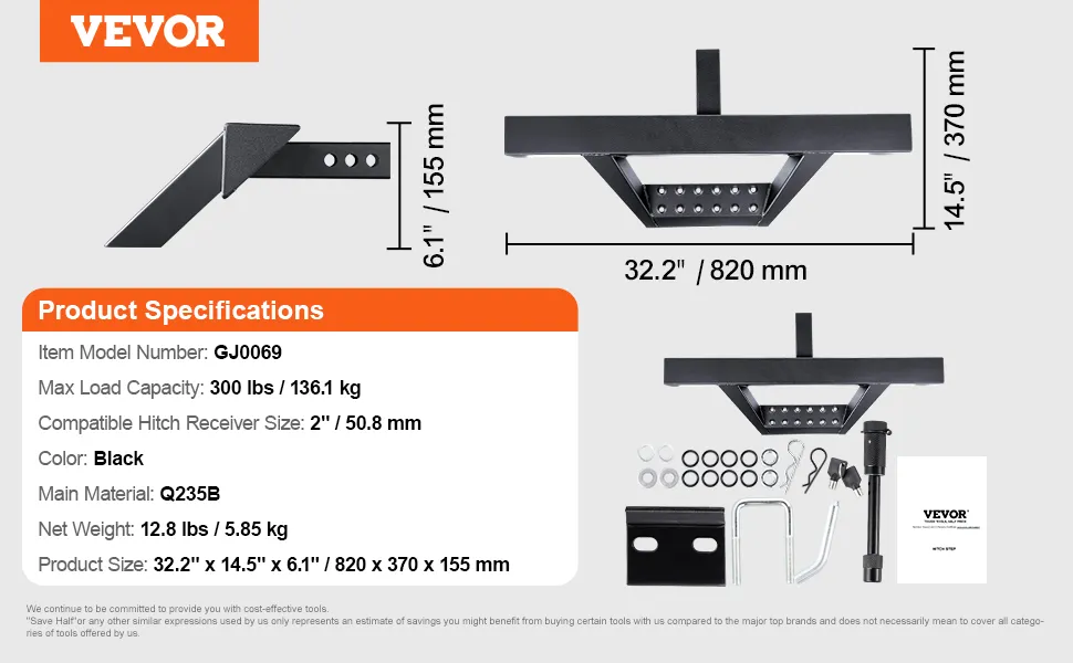 VEVOR Anhängerkupplungsstufe für 2-Zoll-Empfänger, robuste Stahlkonstruktion mit 300 Pfund Tragkraft, Heckstoßstangenschutz mit Stiftverriegelung und Stabilisator, universelle Passform für LKW, SUV, Pickup, Anhänger