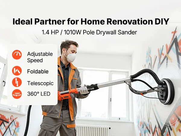 1.4 HP Powerful Motor: This drywall sander comes with a robust motor delivering up to 2200 RPM with 7 adjustable speeds. Ideal for walls, floors, and ceilings, it handles thin putty, thick paint, and aged surfaces with smoother, more effortless sanding