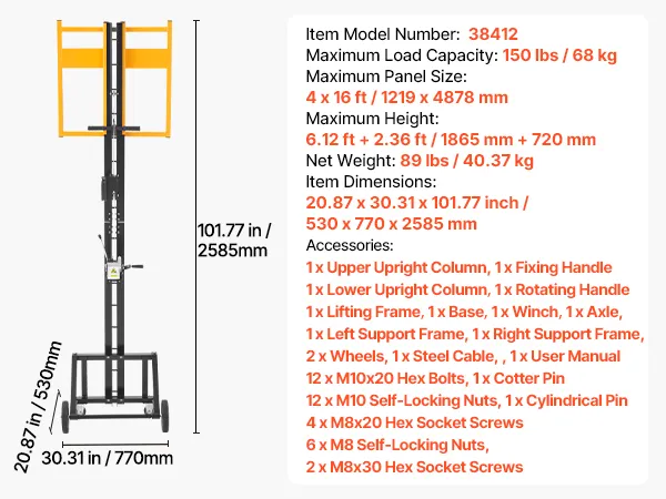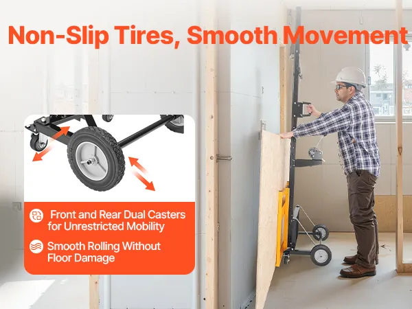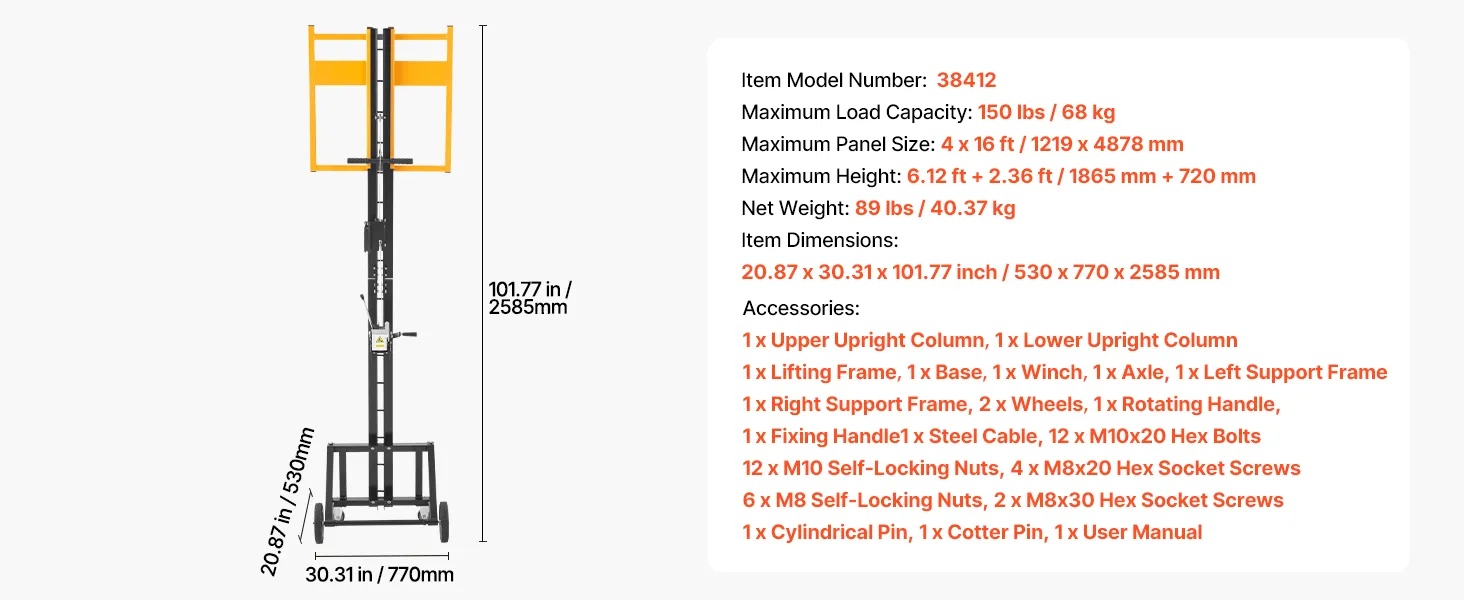 VEVOR Trockenbaulift, Plattenheber mit 68 kg für Decken- & Wandmontage, Ein-Personen-Trockenbau, 1219 x 4878 mm Max. Platten-Vertikalheber mit Rädern, einfacher Transport (Gelb)