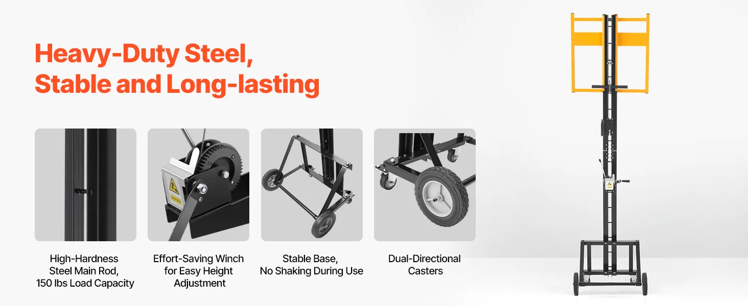 Höhenverstellbar: Der Gipskartonlift ist auf eine maximale Höhe von 1865 + 720 mm (6,12 Fuß + 2,36 Fuß) einstellbar und erfüllt so verschiedene Installationsanforderungen. Ausgestattet mit einer Stahlwinde ermöglicht er eine schnelle Höhenverstellung und bietet hohe Haltbarkeit und Sicherheit.