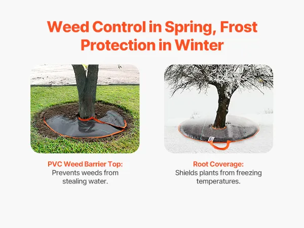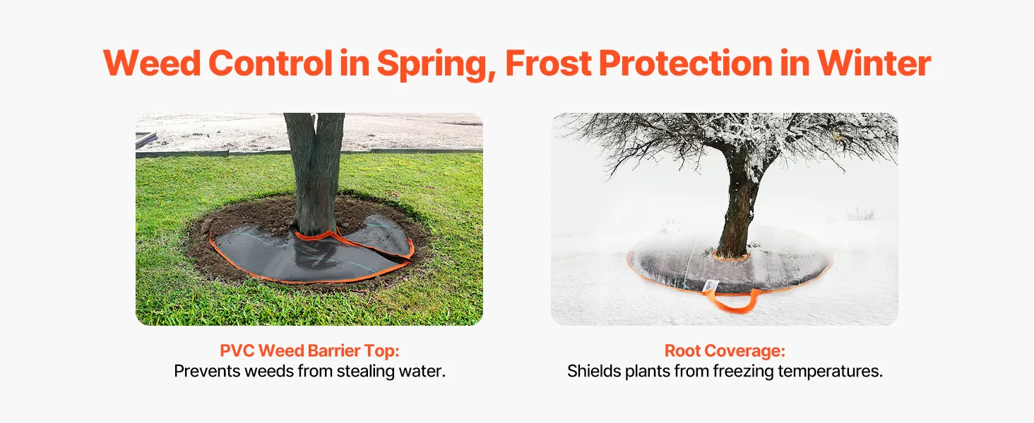 Die Oberseite des Baumbewässerungsbeutels besteht aus unkrautabweisendem Stoff, der im Frühjahr und Sommer das Wachstum von Unkraut reduziert und verhindert, dass andere Pflanzen Wasser stehlen. Im Winter schützt er die Baumwurzeln vor eisigen Temperaturen.