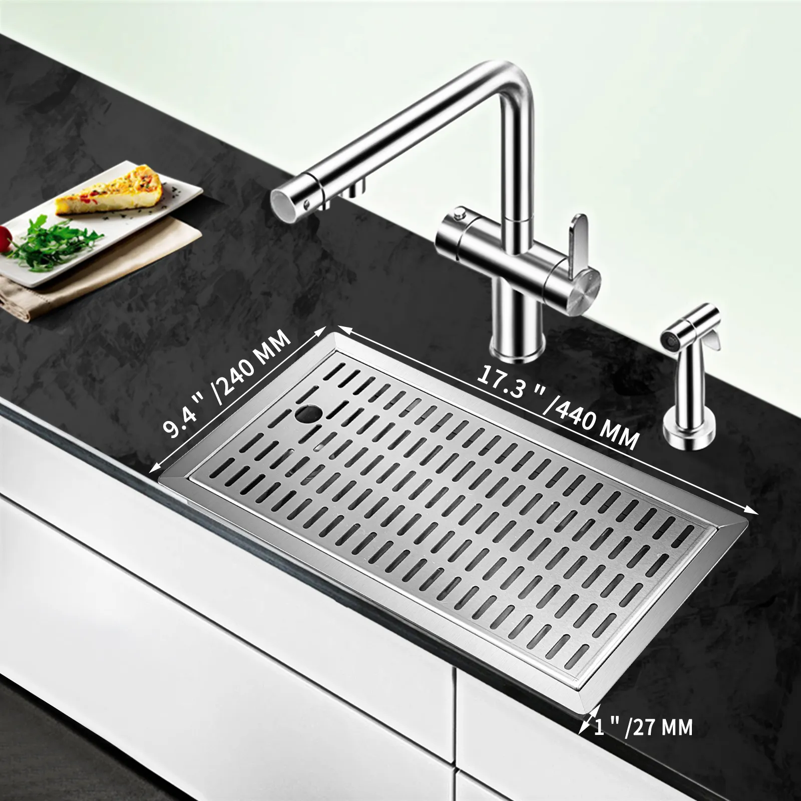 Gesamtgröße (L x B x H): 440 x 240 x 27 mm / 17,3 x 9,4 x 1 Zoll. Flanschbreite: 18 mm. Mit einer angemessenen Größe funktioniert diese Ablaufwanne gut mit einem Einzel- oder Doppelhahnsystem zu Hause oder in einem Restaurant.