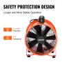 Orangefarbener tragbarer Ventilator von VEVOR mit Flügeln aus Aluminiumlegierung, ETL-Zertifizierung und korrosionsbeständiger Oberfläche.