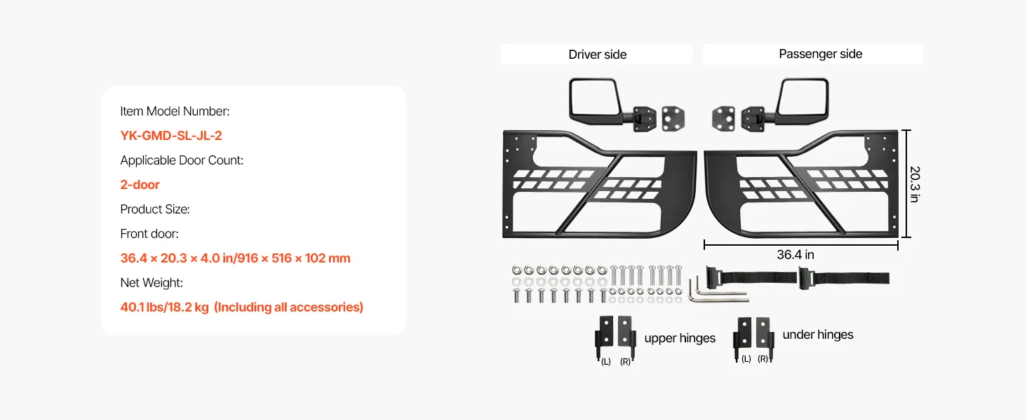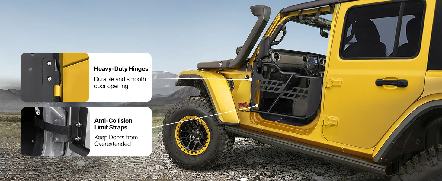 Kompatibilität: Diese Rohrtüren im robusten Jagd-Look wurden für den Jeep Wrangler JL 2018–2024 und den Jeep Gladiator JT 2020–2024 entworfen und passen auf die Fahrer- und Beifahrerseite. Der komplette Satz aus zwei Türen ist nur für den Offroad-Einsatz konzipiert und nicht als Sicherheitsgurt gedacht. Legen Sie immer Ihren Sicherheitsgurt an und fahren Sie vorsichtig. Vermeiden Sie scharfe Kurven und plötzliche Manöver