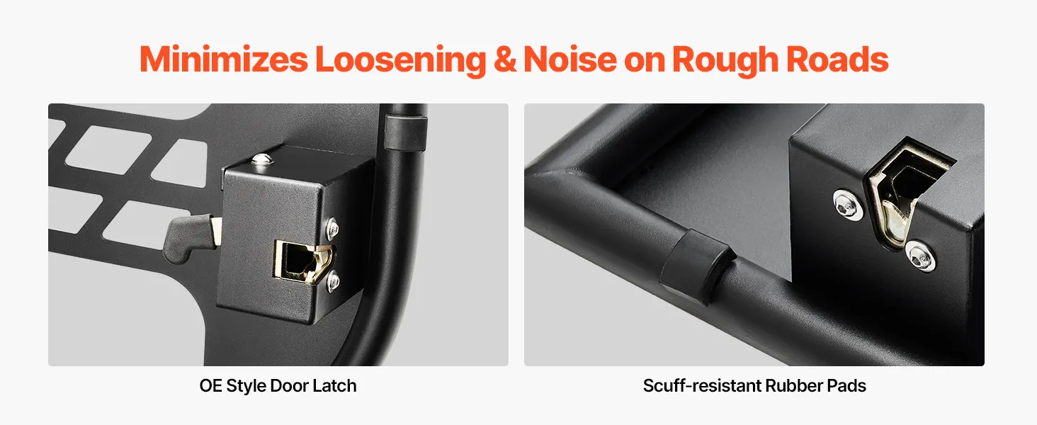 OE-Verriegelung mit Gummipolstern: Die Hochleistungsverriegelungen der Jeep-Rohrtür sorgen für einen sicheren Sitz mit dem werkseitigen Türverriegelungssystem für einen reibungslosen Betrieb. Verbesserte dicke Gummipolster vermeiden Kratzer beim Öffnen und Schließen und verringern Klappergeräusche auf unebenem Gelände und bei hoher Geschwindigkeit