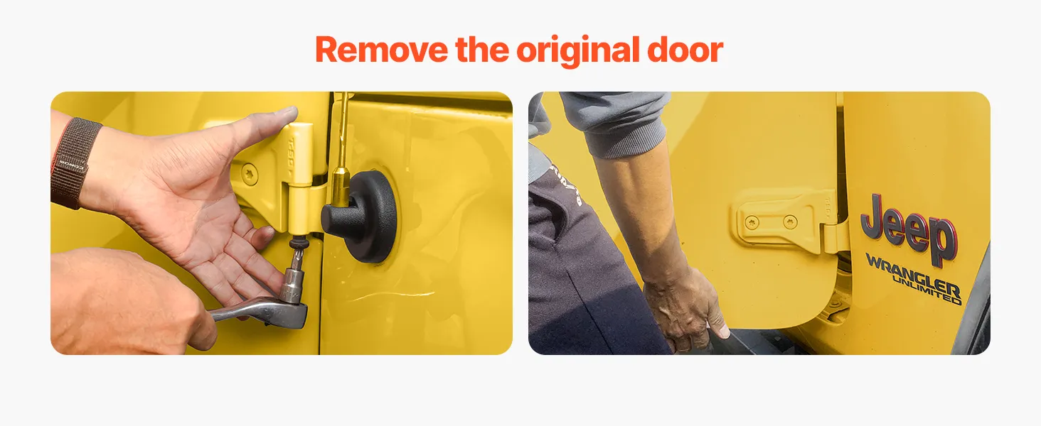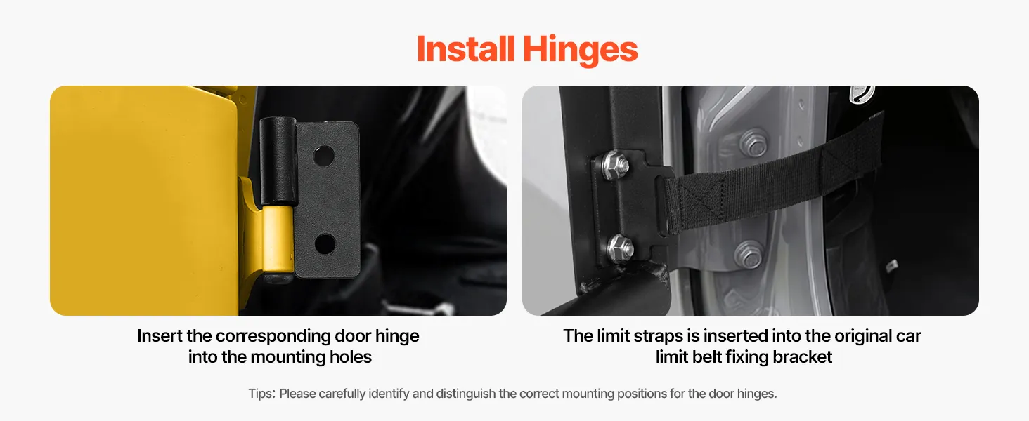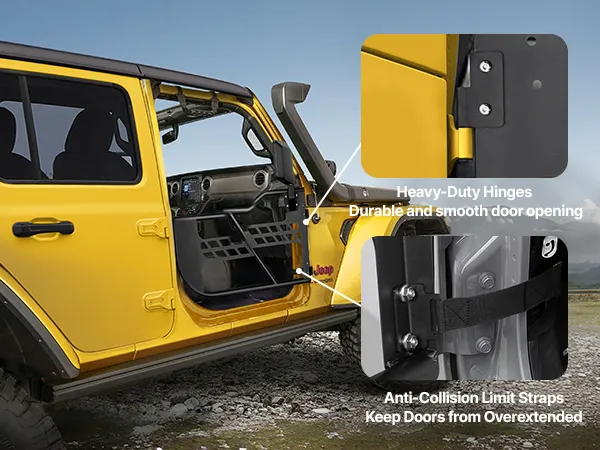 Einfache Installation: Diese Jeep-Rohrtüren sind mit hochbelastbaren Scharnieren ausgestattet und erfordern weder Bohren noch Schweißen. Sie lassen sich daher problemlos an den werkseitigen Türscharnieren installieren. Die mitgelieferten Nylon-Begrenzungsgurte verhindern eine Überdehnung und verringern so das Kollisionsrisiko