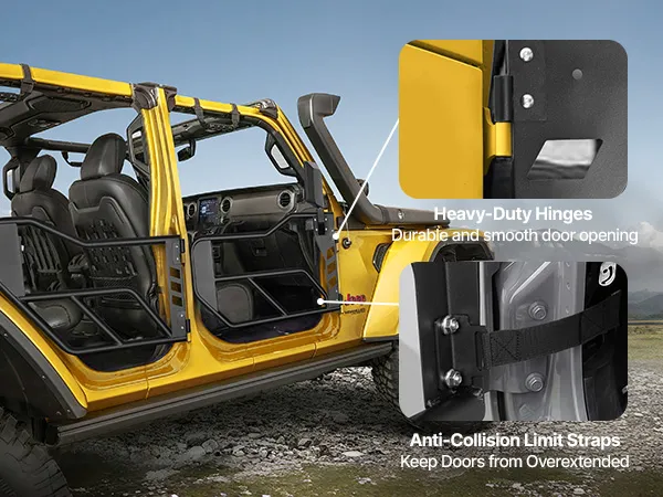 Einfache Installation: Diese Jeep-Rohrtüren sind mit hochbelastbaren Scharnieren ausgestattet und erfordern weder Bohren noch Schweißen. Sie können problemlos an den werkseitigen Türscharnieren installiert werden. Die mitgelieferten Nylon-Begrenzungsgurte verhindern eine Überdehnung und verringern so das Kollisionsrisiko