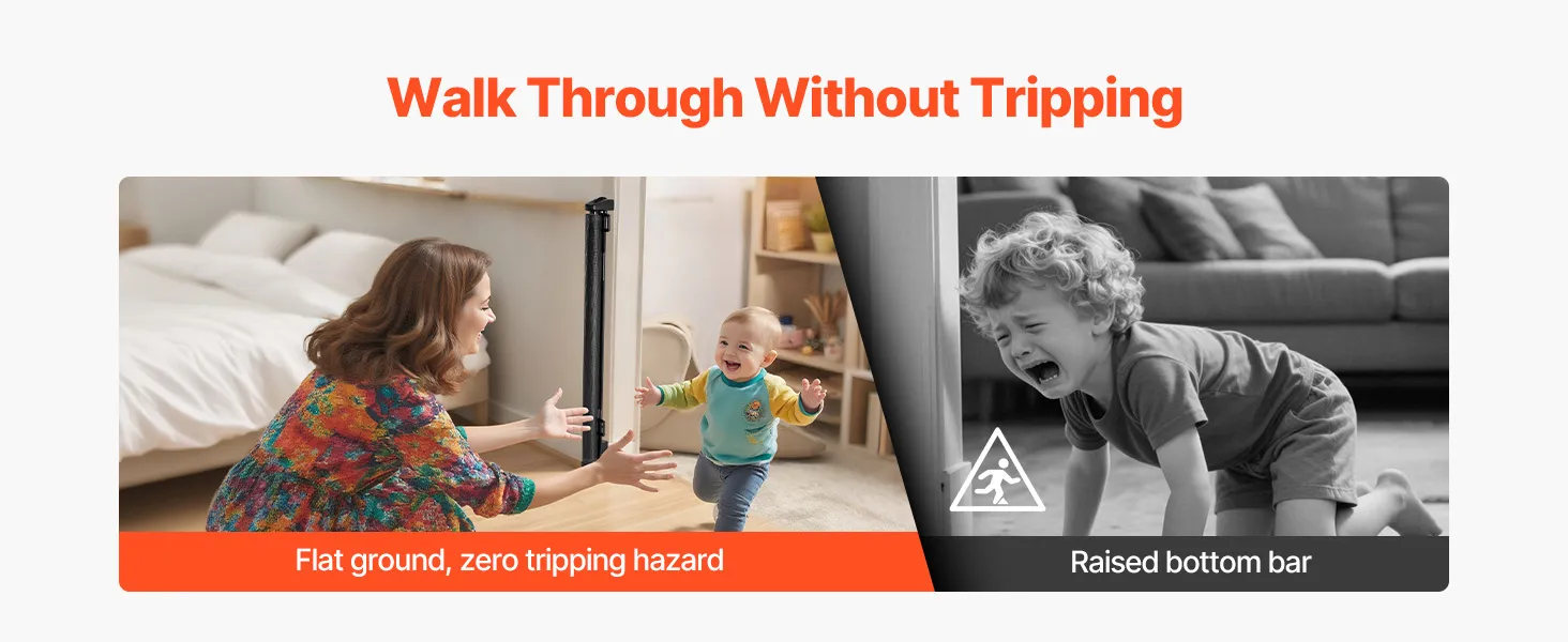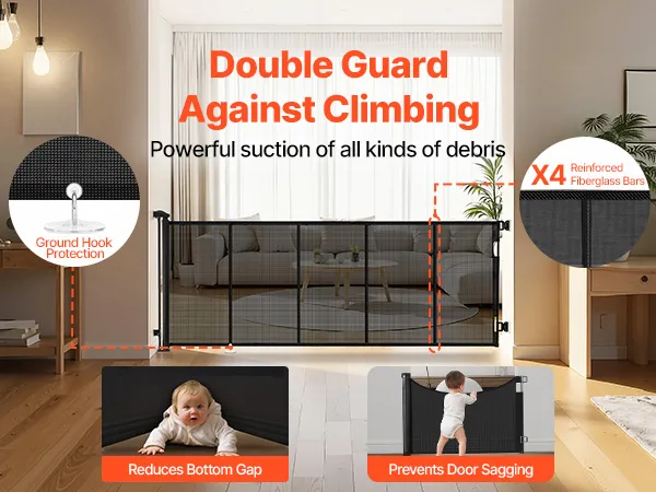 Stabil & ausbruchsicher: Das einziehbare Gitter verfügt über vier integrierte Fiberglasstreifen, die das Gitter aufrecht halten, während Bodenhaken verhindern, dass Babys oder Haustiere darunter durchdringen. Der obere Knopf lässt sich durch Drücken und Drehen entriegeln – einfach für Erwachsene, schwierig für Kinder