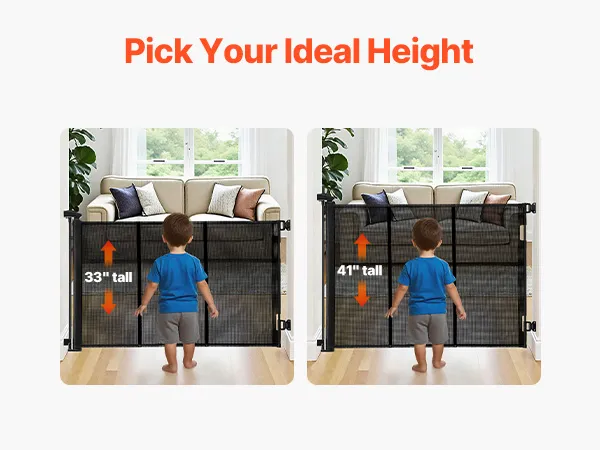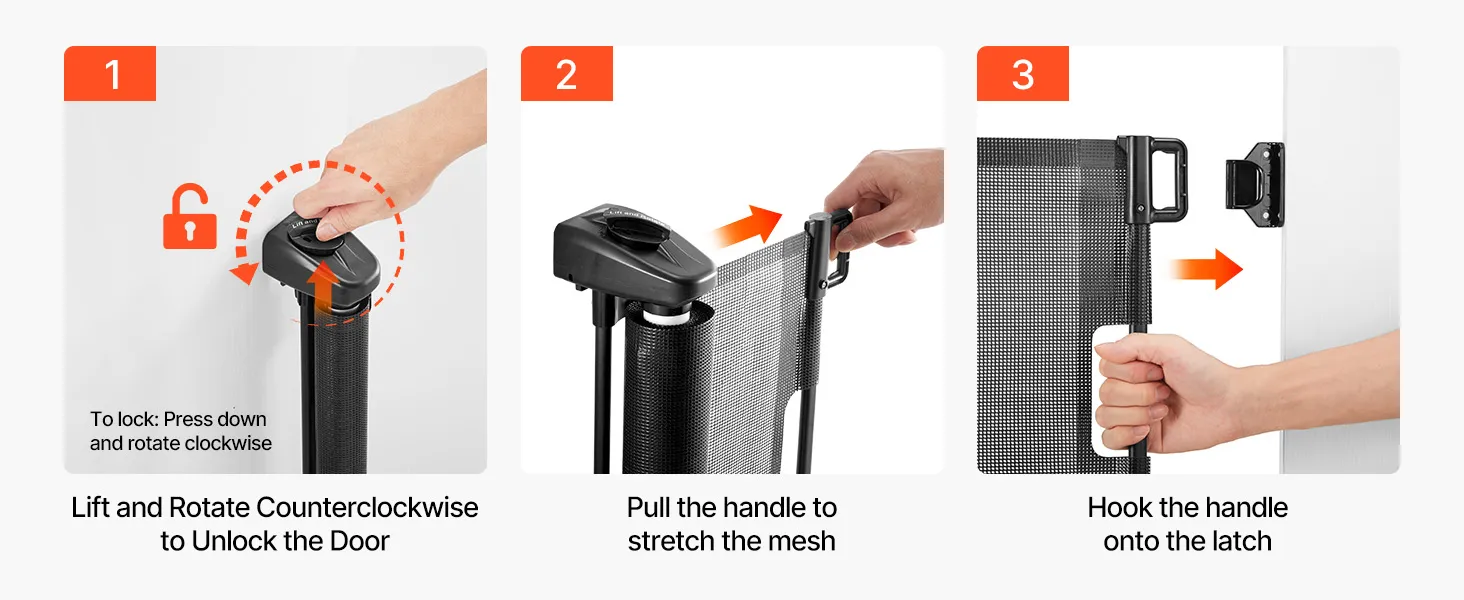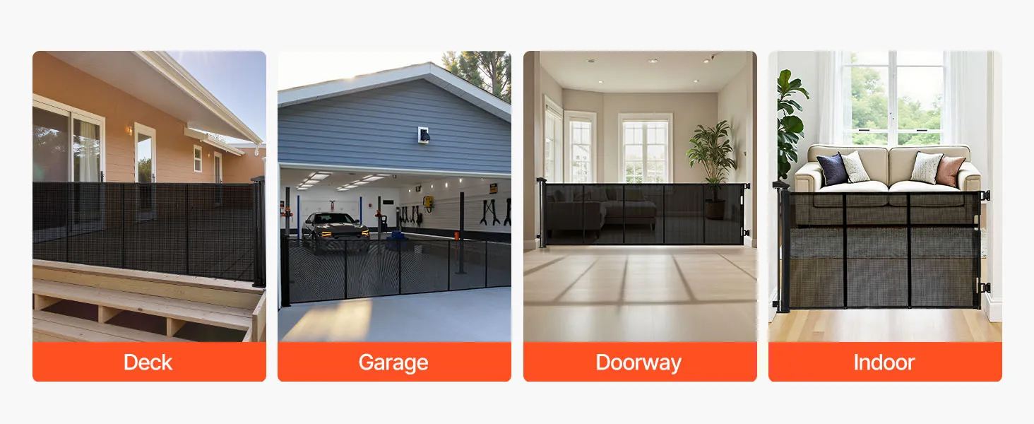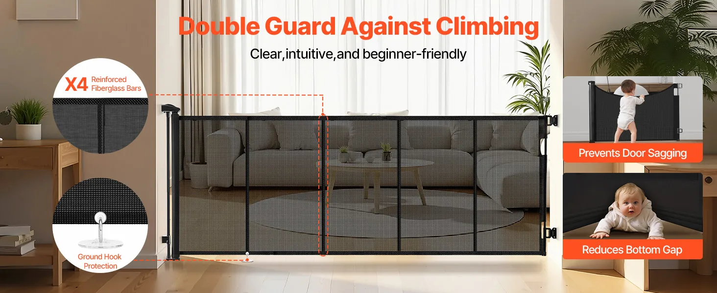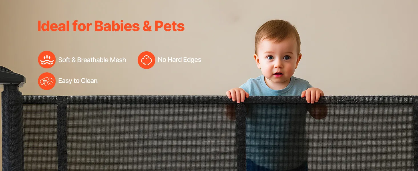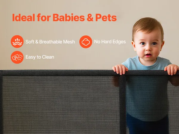 Sichere Trennung ohne Sichtbehinderung: Das einziehbare Schutzgitter ist aus hochfestem PVC-Netz in Babyqualität gefertigt, das sich weich anfühlt, atmungsaktiv und durchsichtig ist, sodass Sie Ihr Baby oder Haustier aus der Ferne überwachen und gleichzeitig eine sichere Barriere schaffen können