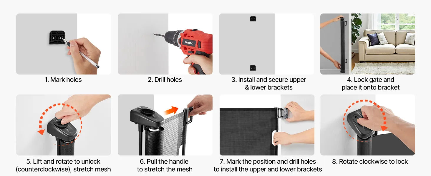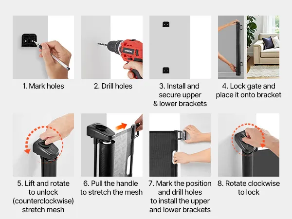 Beschädigungsfreie Montage an Fußleisten: Die unteren Halterungen sind vertikal verstellbar, sodass das einziehbare Hundegitter ohne Beschädigung über Fußleisten montiert werden kann. Alle Beschläge sind im Lieferumfang enthalten und ermöglichen eine schnelle und einfache Installation