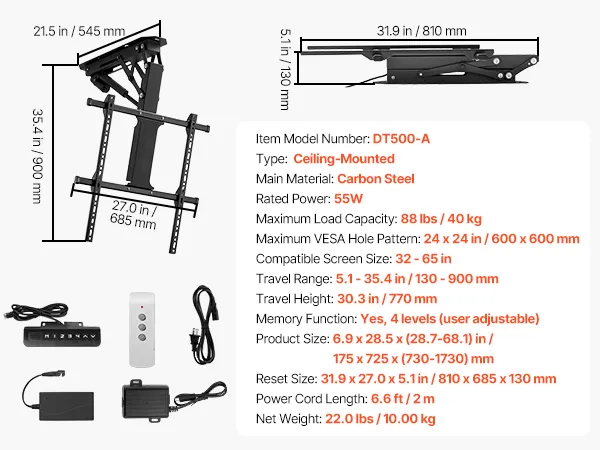 Stufenlos höhenverstellbar: Sie können die Deckenhalterung mit der kabellosen Fernbedienung oder dem kabelgebundenen Handschalter bedienen und aus jeder Entfernung frei steuern. Mit einer Hubhöhe von 30,3 Zoll (77 cm) können Sie die Höhe problemlos in einem Bereich von 5,1 bis 35,4 Zoll (13-90 cm) einstellen, um die optimale Betrachtungshöhe zu finden. Mit der programmierbaren Speicherfunktion können Sie bis zu 4 voreingestellte Höhen für den Langzeitgebrauch speichern
