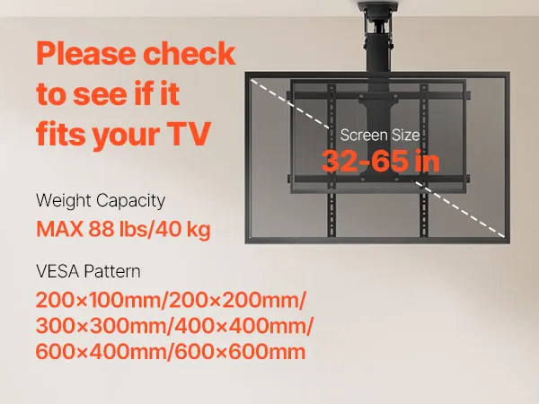 Unterstützt 1651 mm Fernseher: Es unterstützt sowohl flache als auch gebogene Fernseher von 32 bis 65 Zoll (813-1651 mm) und ist mit den VESA-Mustern 20 x 10 cm, 20 x 20 cm, 30 x 30 cm, 40 x 40 cm, 60 x 40 cm, 60 x 60 cm kompatibel. Laut Handbuch können Sie die Halterung an der Oberfläche des Holzbalkens oder der Beton-/Ziegel-Massivwanddecke befestigen. Achten Sie bei der Installation darauf, die Löcher auszurichten und genügend Abstand zwischen dem Bildschirm und der Decke zu lassen