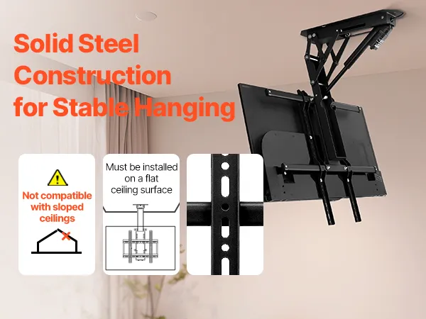 Robuste Stahlkonstruktion: Diese elektrische Deckenhalterung für Fernseher besteht aus robustem pulverbeschichtetem Stahl und kann ein Fernsehgewicht von bis zu 88 lbs (40 kg) tragen. Sie oxidiert oder beschädigt nicht schnell bei längerem Gebrauch und hält Verformungen unter Druck stand. In Verbindung mit einem leistungsstarken Motor gewährleistet sie sicheres und stabiles Heben und Senken ohne Wackeln oder Lösen, selbst bei großen Fernsehern