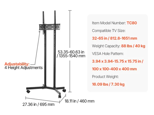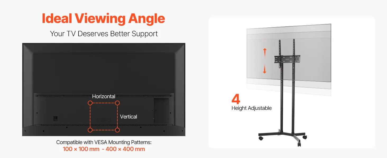 Universelle Kompatibilität: Dieser rollbare TV-Ständer ist für 32-65 Zoll (812,8-1651 mm) große LED-, LCD- und OLED-Flach- und Curved-TVs konzipiert und unterstützt VESA-Montagemuster von 3,94 x 3,94 bis 15,75 x 15,75 Zoll (100 x 100 bis 400 x 400 mm). Er gewährleistet optimale Kompatibilität mit Ihrem Fernseher und ermöglicht eine einfache Installation unabhängig von Größe und Typ Ihres Fernsehers