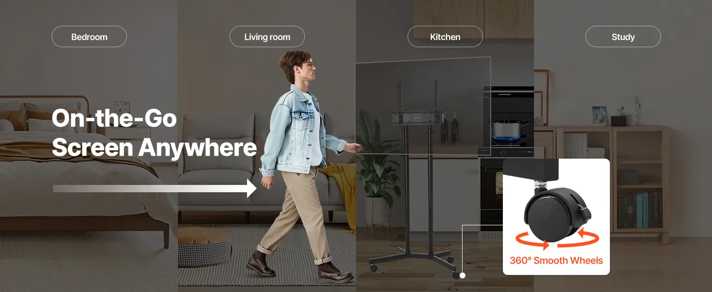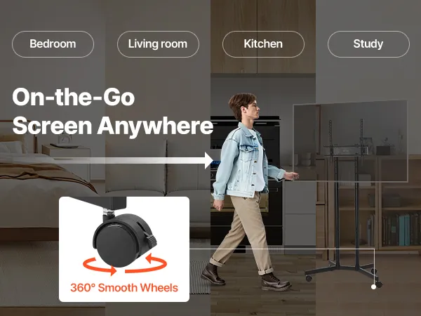 Unsere mobile TV-Halterung ist mit Schwenkrädern ausgestattet, sodass Sie den Fernseher schnell von einem Raum in den anderen bewegen können.