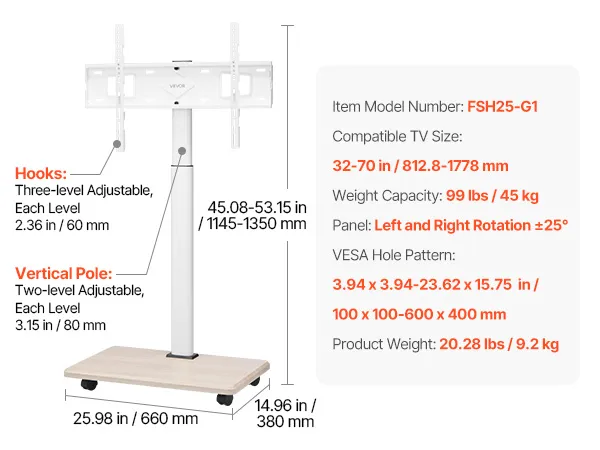 Dieser rollbare TV-Ständer erfüllt mit seinen verschiedenen Einstellmöglichkeiten unterschiedliche Fernsehvorlieben und sorgt dafür, dass sich Ihr Fernseher immer auf der idealen Höhe für bequemes Fernsehen befindet.