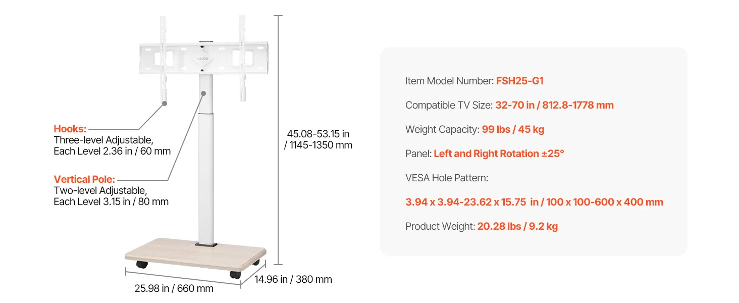 VEVOR rollbarer TV-Ständer TV-Wagen für 812,8-1778 mm TVs bis zu 45 kg, 25° Links-Rechts-Drehung & höhenverstellbare TV-Halterung mit Regal für Ecke Schlafzimmer Wohnzimmer (max. 600 x 400 mm)