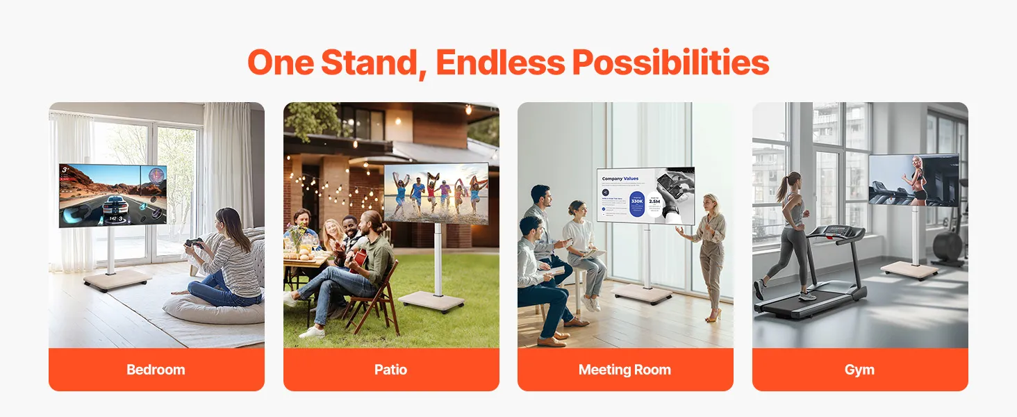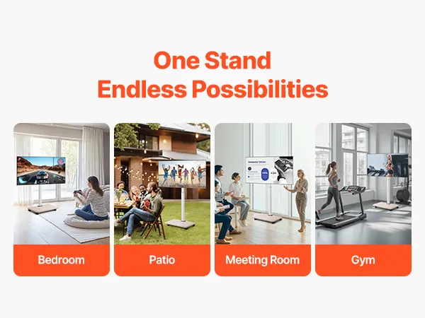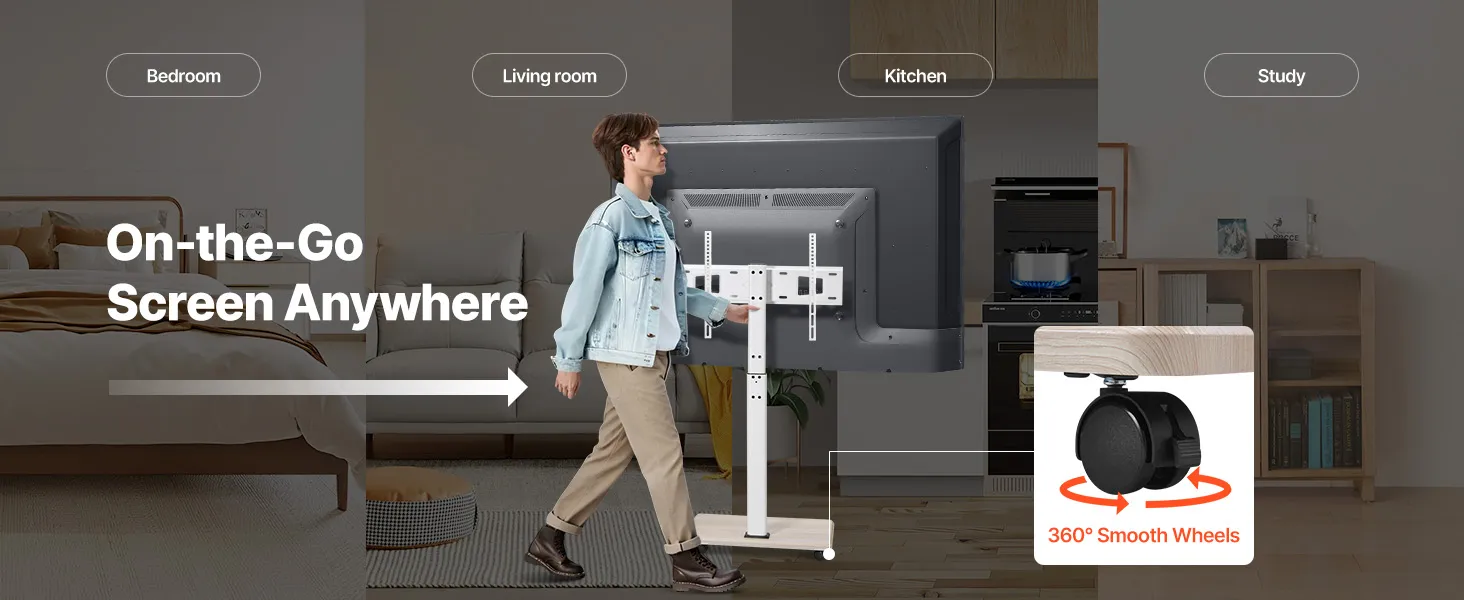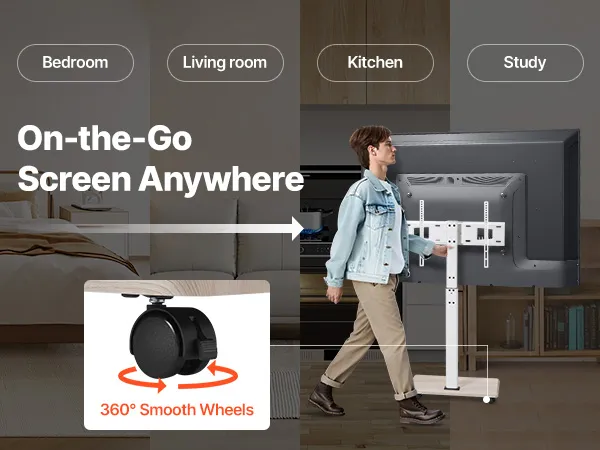 Unsere mobile TV-Halterung ist mit Schwenkrädern ausgestattet, sodass Sie den Fernseher schnell von einem Raum in den anderen bewegen können.