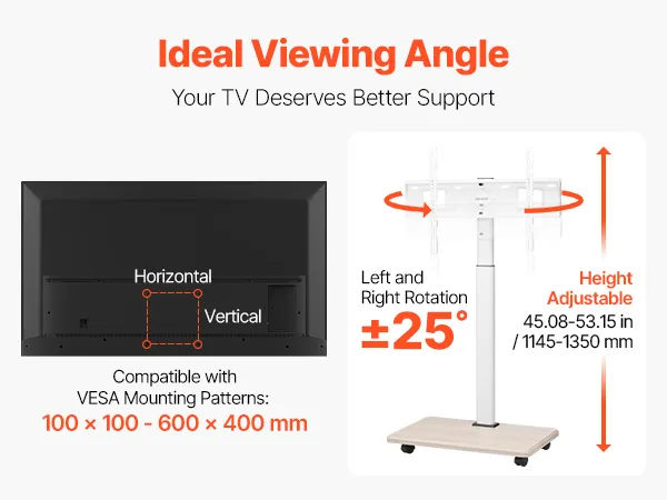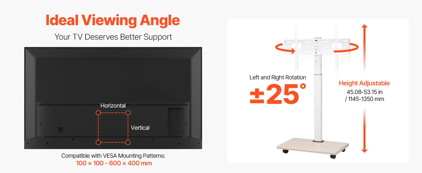 Flexible Einstellbarkeit: Dieser bewegliche TV-Ständer bietet Höhenverstellmöglichkeiten, sodass Sie den Fernseher je nach Raumaufteilung und Sehbedürfnissen ganz einfach auf die ideale Höhe einstellen können. Dank der ±25°-Drehfunktion können Sie den Fernseher frei drehen und so ein optimales Rundum-Seherlebnis genießen