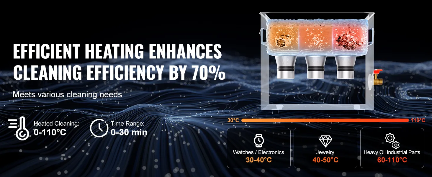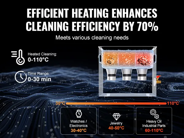 Reinigung mit Hitze: Für verschiedene Gegenstände wie Schmuck, Uhren/elektronisches Zubehör und stark fettige Industriekomponenten können Sie die Reinigungstemperatur von 0 bis 110 °C einstellen, um die Schmutzlösung zu beschleunigen. Das Ergebnis ist eine effizientere und gezieltere Reinigung. Der Hochtemperaturmodus löst hartnäckige Fette schnell, während der Niedertemperaturmodus empfindliche Materialien schont.