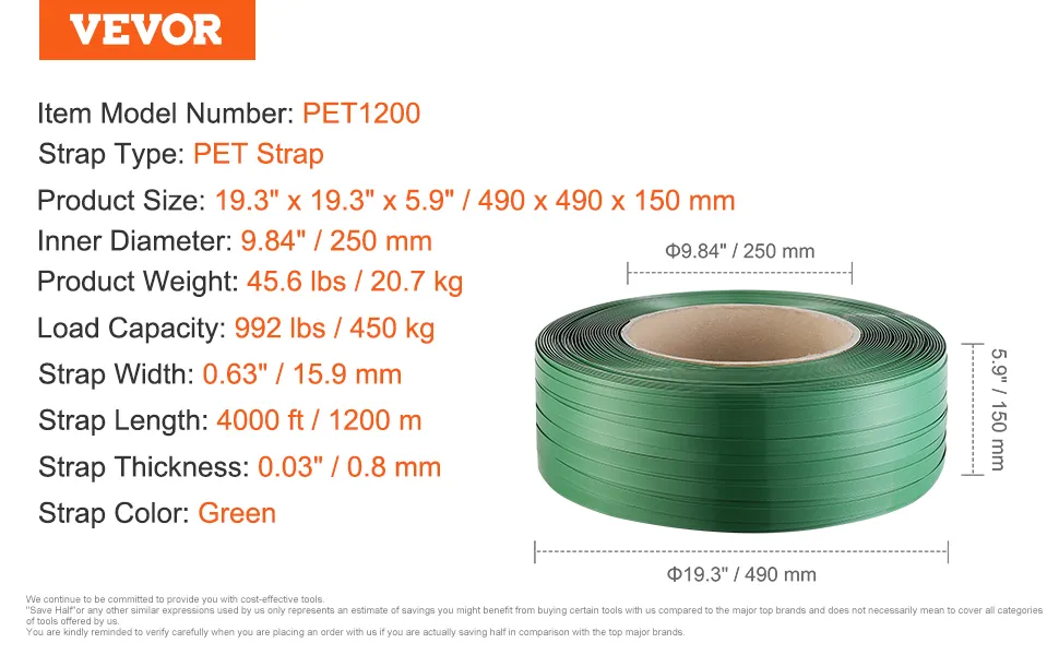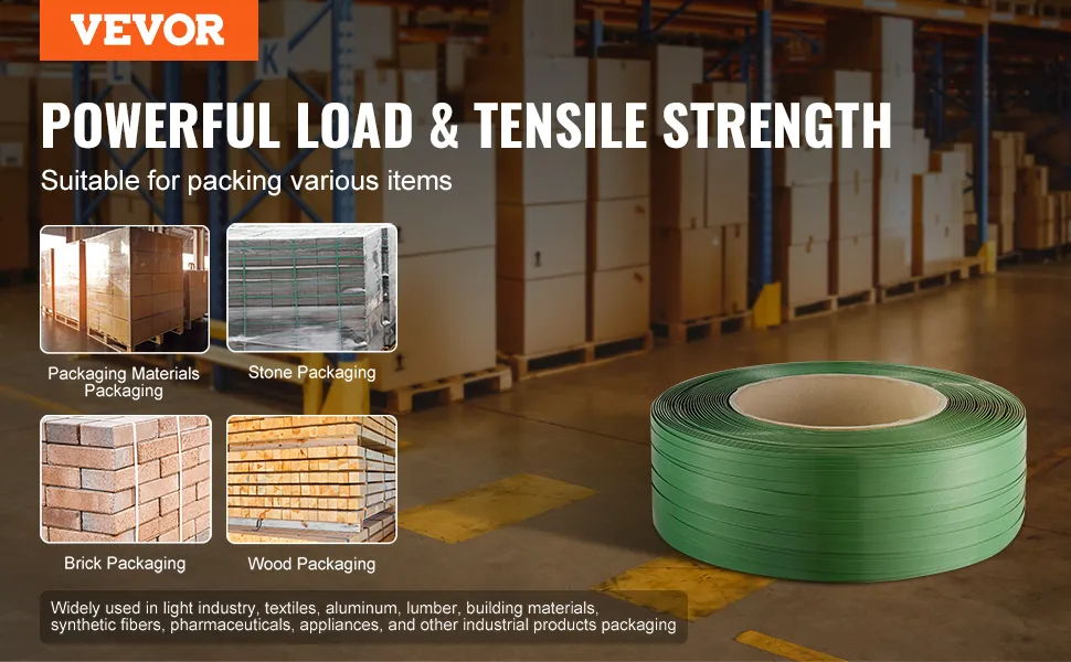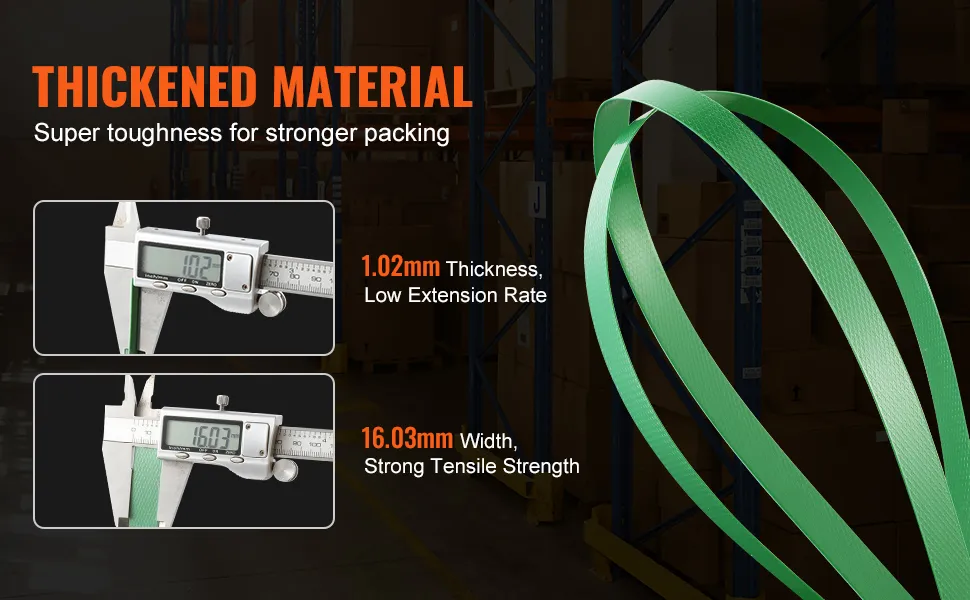 VEVOR Umreifungsband aus Polyester/PET, 1200 m Länge x 15,9 mm Breite x 0,8 mm Dicke, 450 kg Bruchfestigkeit, Verpackungsband für Paletten,Umreifungsgerät, tragbar, grün
