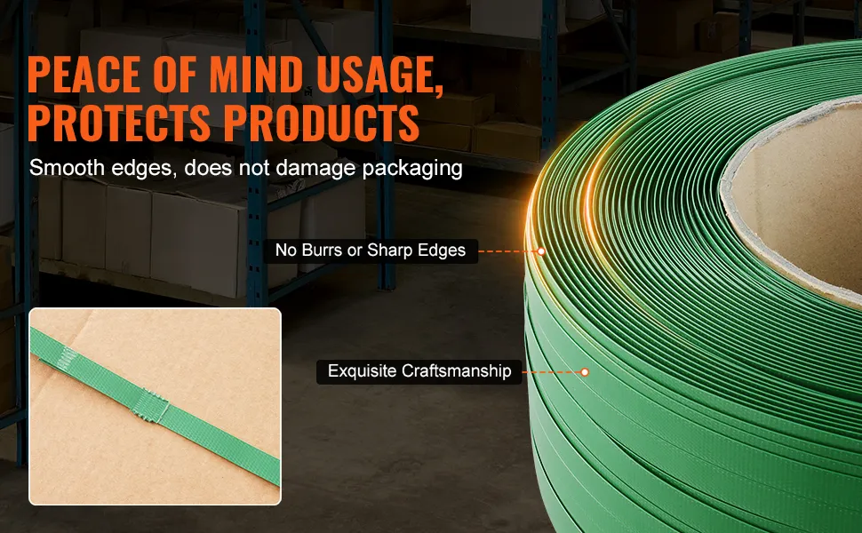 Die Kanten unserer Umreifungsbandrolle sind speziell behandelt, um glatt und sicher zu sein. Keine scharfen Kanten bedeuten keine Schnitte oder Risse mehr – nur einfache Handhabung und keine Schäden an Ihrer Verpackung.