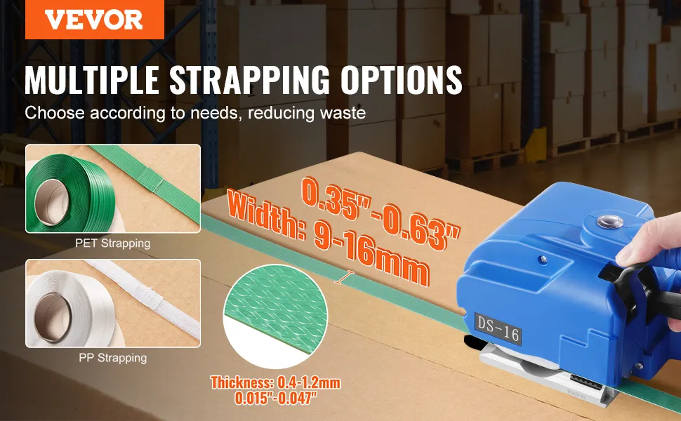Vielseitige Umreifungsoptionen: Unsere elektrische Umreifungsmaschine funktioniert hervorragend mit Umreifungsbändern aus Polypropylen (PP) und Polyester (PET). Sie verarbeitet Breiten von 0,35 bis 0,63 Zoll (0,89 bis 1,6 cm)und Dicken von 0,02 bis 0,05 Zoll (0,05 bis 0,127 cm). Das bedeutet, dass Sie problemlos Artikel unterschiedlicher Größe und Gewichte verpacken und Kosten sparen können, indem Sie das richtige Band für die jeweilige Aufgabe auswählen.