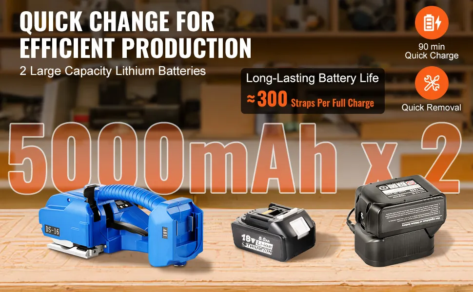 Großer Akku für effiziente Produktion: Dieses elektrische Umreifungsgerät wird von zwei 5000-mAh-Lithiumbatterien angetrieben und ermöglicht Ihnen mit einer vollen Ladung bis zu 300 Umreifungsvorgänge. Es lädt sich in nur 90 Minuten schnell auf und hat ein abnehmbares Design, sodass Sie die Batterien unterwegs austauschen können. Weniger Ausfallzeiten bedeuten mehr Produktivität und weniger Aufwand für Sie.