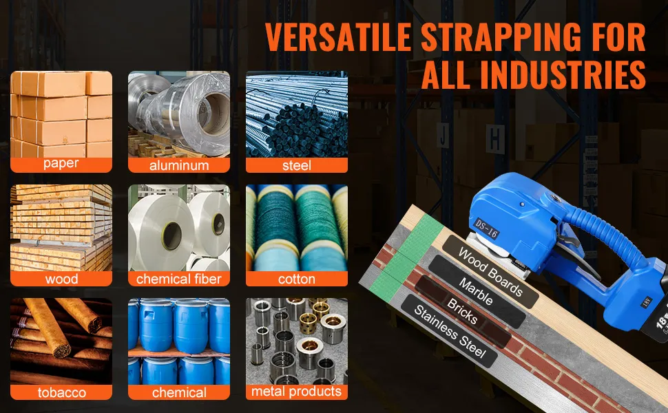 Perfekt für verschiedene Branchen: Ob Sie Papier, Aluminium, Stahl, Holz, Chemiefasern, Baumwolle, Tabak, Chemikalien oder Metallprodukte herstellen, unser Umreifungsgerät hilft Ihnen dabei. Es verarbeitet alles von Holzplatten und Marmor bis hin zu Ziegeln und Stahl und steigert so Ihre Effizienz und Produktqualität auf ganzer Linie.