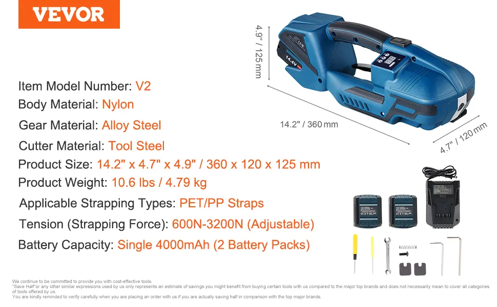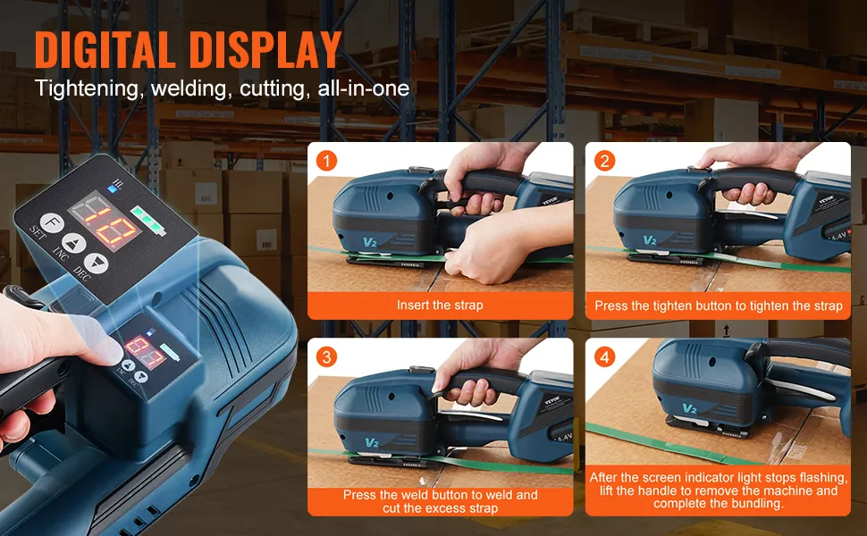VEVOR Elektrische Umreifungsmaschine, für 0,35"-0,63" PP-PET-Bänder, tragbares elektrisches Umreifungswerkzeug mit Digitalanzeige, 2 x 4000 mAh batteriebetriebenes automatisches Umreifungswerkzeug für Verpackungskartonpaletten