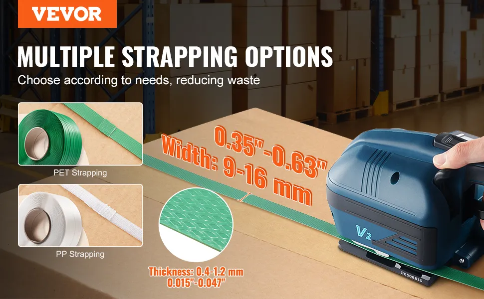 Vielseitige Umreifungsoptionen: Unsere elektrische Umreifungsmaschine funktioniert hervorragend mit Umreifungsbändern aus Polypropylen (PP) und Polyester (PET). Sie verarbeitet Breiten von 0,35 bis 0,63 Zoll (0,89 bis 1,6 cm) und Dicken von 0,02 bis 0,05 Zoll (0,05 bis 0,127 cm). Das bedeutet, dass Sie problemlos Artikel unterschiedlicher Größe und Gewichte verpacken und Kosten sparen können, indem Sie das richtige Band für die jeweilige Aufgabe auswählen.