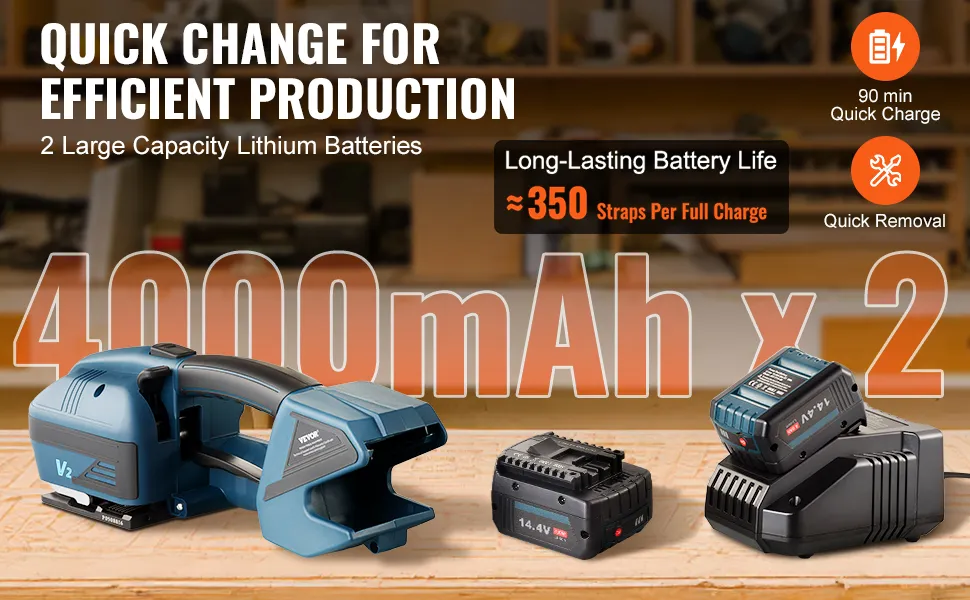 Großer Akku für effiziente Produktion: Dieses elektrische Umreifungsgerät wird von zwei 4000-mAh-Lithiumbatterien angetrieben und ermöglicht Ihnen mit einer vollen Ladung bis zu 350 Umreifungen. Es lädt sich in nur 90 Minuten schnell auf und hat ein abnehmbares Design, sodass Sie die Batterien unterwegs austauschen können. Weniger Ausfallzeiten bedeuten mehr Produktivität und weniger Aufwand für Sie.